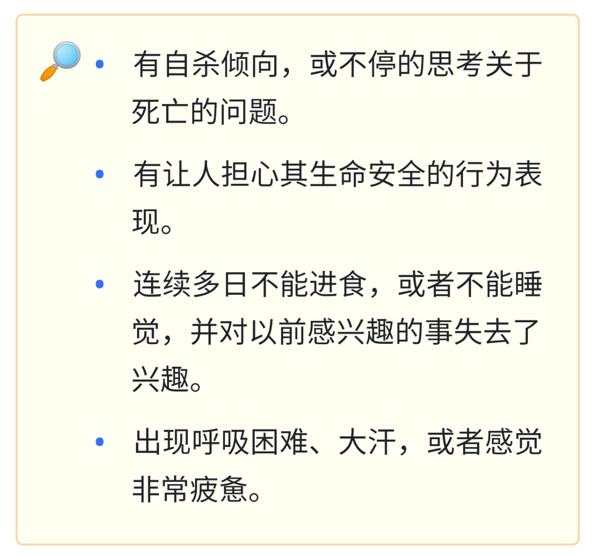 以下症状如果出现5个以上,持续时间大于2周;或者症状严重到影响正常生活,需要请有资质的临床专业人员进行进一步评估: